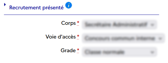 Dans cet onglet, je sélectionne le recrutement auquel je me présente : je choisis le secteur d’enseignement, puis la voie d’accès et enfin le concours auquel je m’inscris.