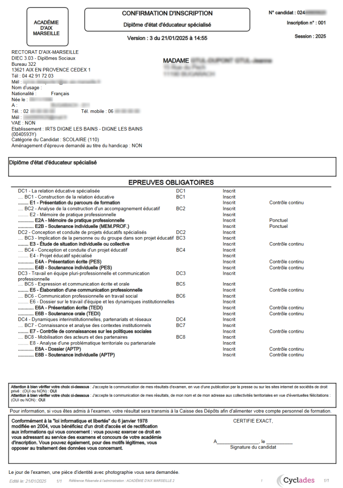 En haut à droite du document, sont affichés le numéro de candidat, le numéro d’inscription et le numéro de version du document.